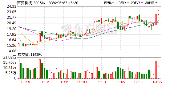百邦科技近日股价上涨明显。3月26日,其股价大涨超13%,3月27日再涨3.41%,两个交易日累计涨近17%。公司最新市值约30亿元。