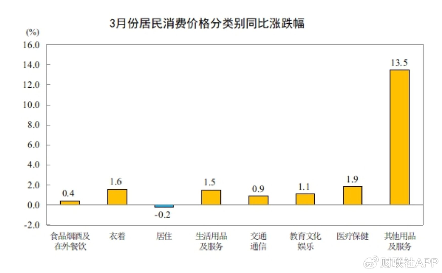 其他七大类价格同比六涨一降。其中,其他用品及服务、医疗保健、衣着价格分别上涨13.5%、1.9%和1.6%,生活用品及服务、教育文化娱乐、交通通信价格分别上涨1.5%、1.1%和0.9%;居住价格下降0.2%。