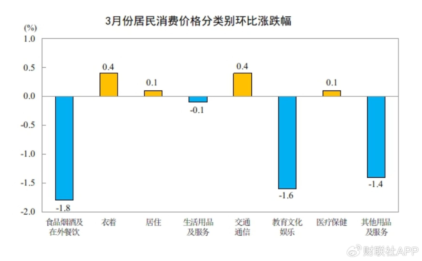 3月份,全国居民消费价格环比下降0.7%。其中,城市下降0.7%,农村下降0.5%;食品价格下降2.7%,非食品价格下降0.2%;消费品价格下降0.3%,服务价格下降1.1%。