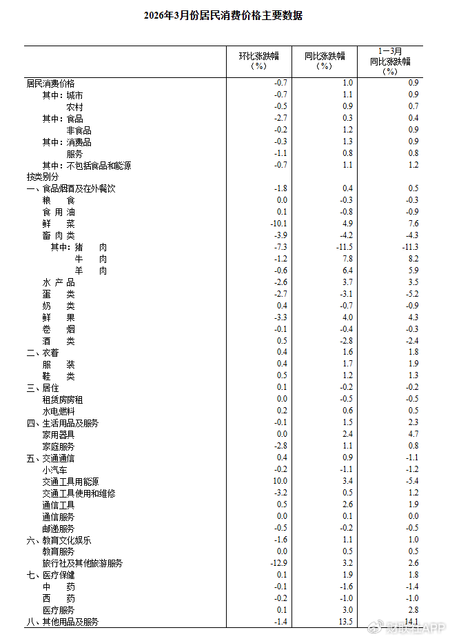 2026年3月份,全国居民消费价格同比上涨1.0%。其中,城市上涨1.1%,农村上涨0.9%;食品价格上涨0.3%,非食品价格上涨1.2%;消费品价格上涨1.3%,服务价格上涨0.8%。1—3月平均,全国居民消费价格比上年同期上涨0.9%。